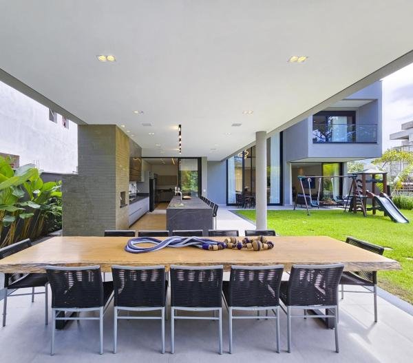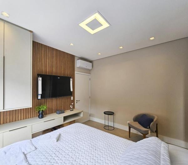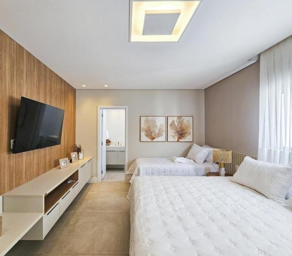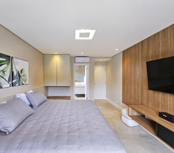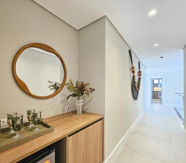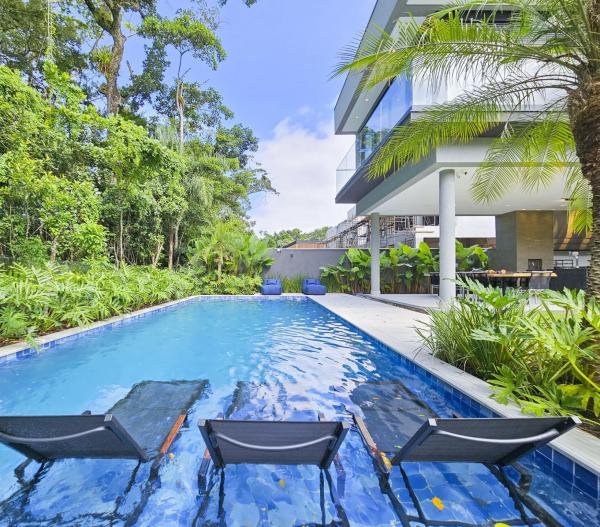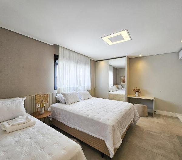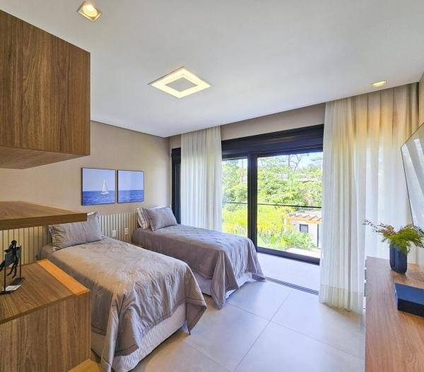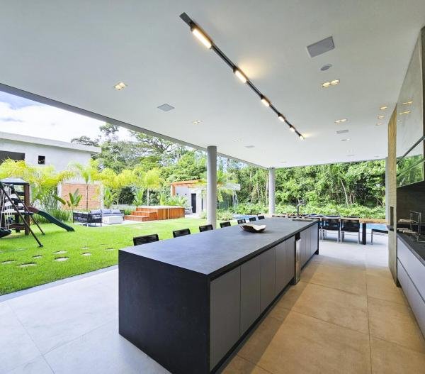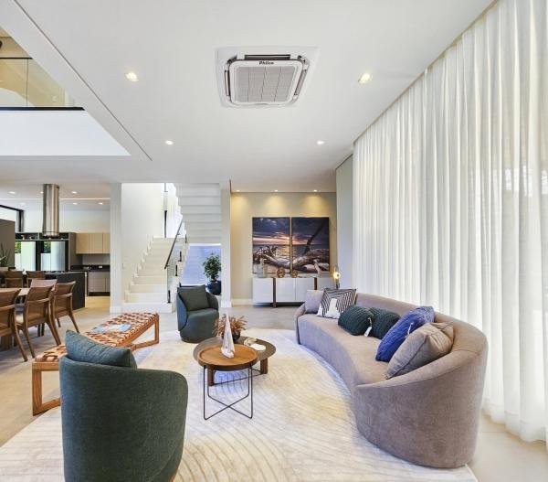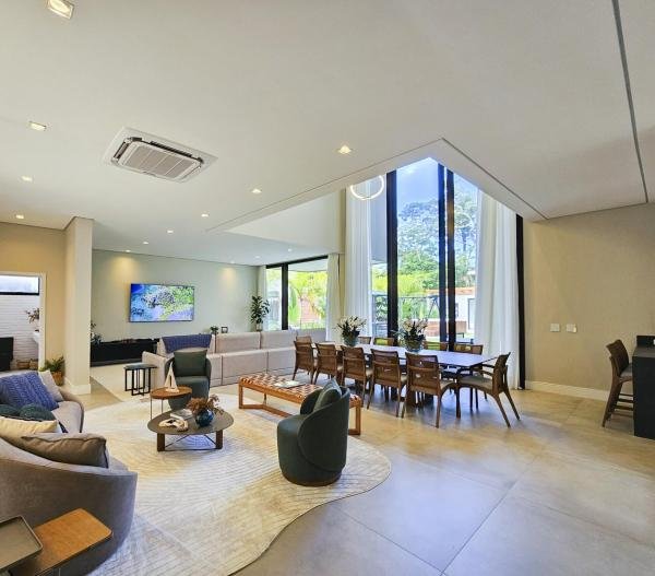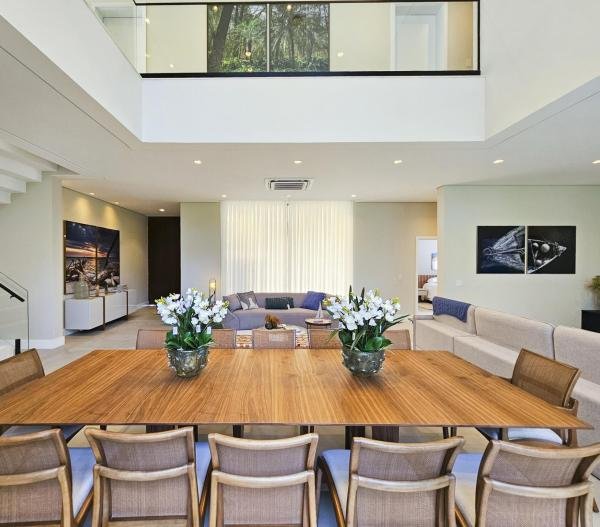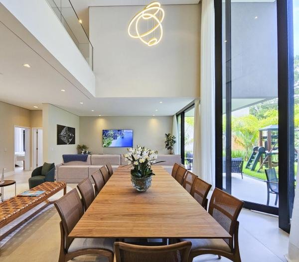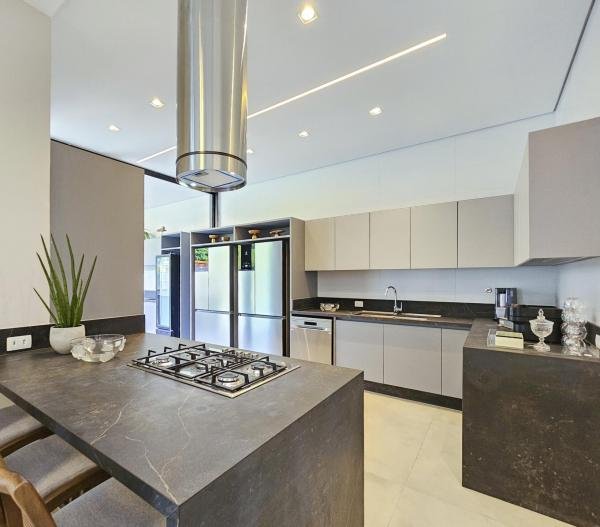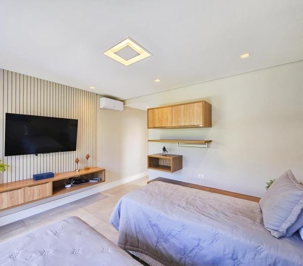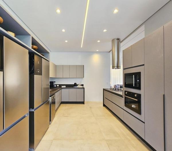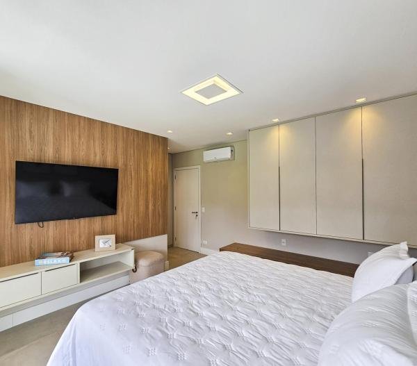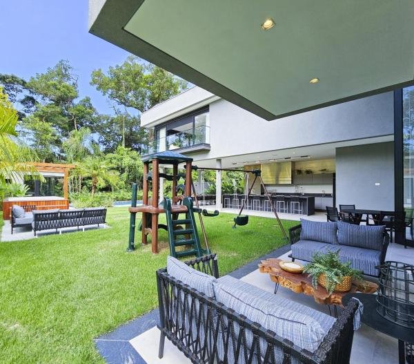 Majestosa e exuberante, é a definição para essa mansão, conta com 7 suítes, sendo uma no térreo, todas com armários embutidos e ar-condicionado, dentre elas, uma suíte master com closet e banheira (WCs Sr. e Sra), 2 pavimentos, living para 3 ambientes, com ar-condicionado, persianas automáticas, porta de entrada com fechadura eletrônica, lavabo, adega, cozinha americana, com armários, completa. Possui dormitório e WC de empregada, depósito, área de serviço, 6 vagas de garagem e uma copa no pavimento superior. Sua área de lazer oferece, piscina aquecida, climatizada e integrada com a sauna, jacuzzi, energia solar, churrasqueira e forno de pizza integrada com a cozinha, chopeira, playground, lavabo e sistema de monitoramento. A área construída é de 622,38 m2 em um terreno de 752,25 m2. A casa está toda mobiliada com móveis da kitchens, desde banheiros, quartos, cozinha e etc....Pisos e revestimentos da Portobello, bancadas em Dekton e metais Docol.