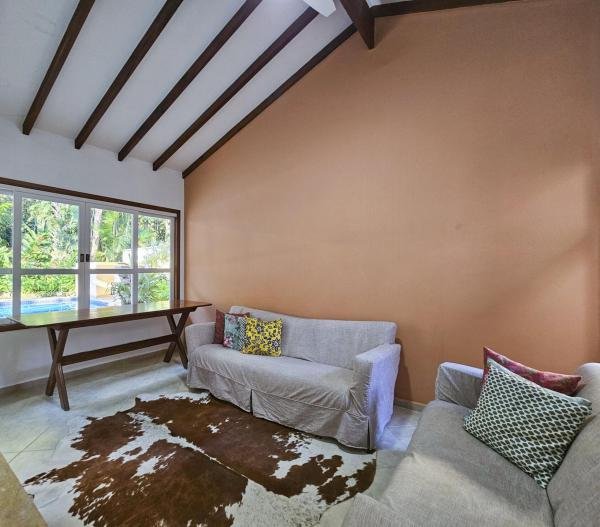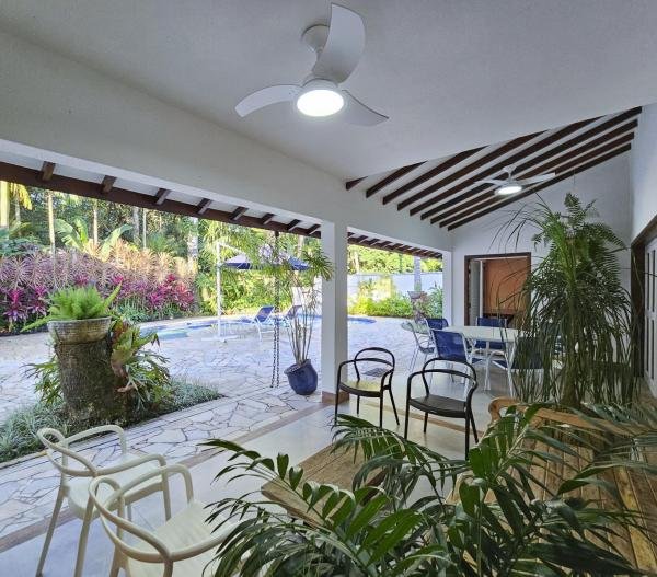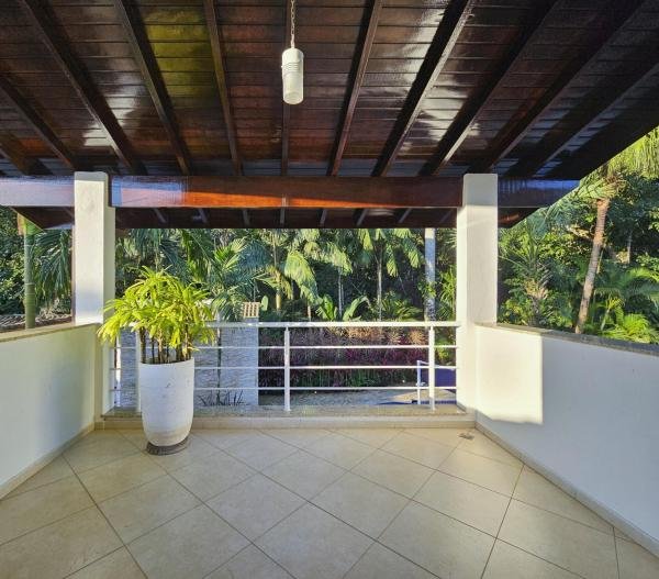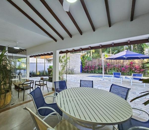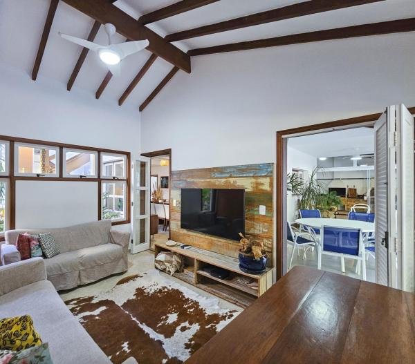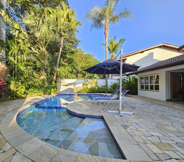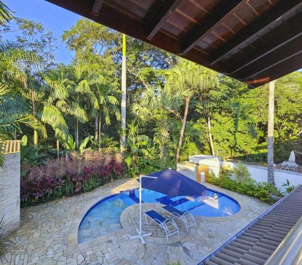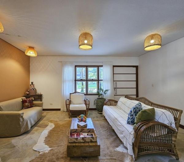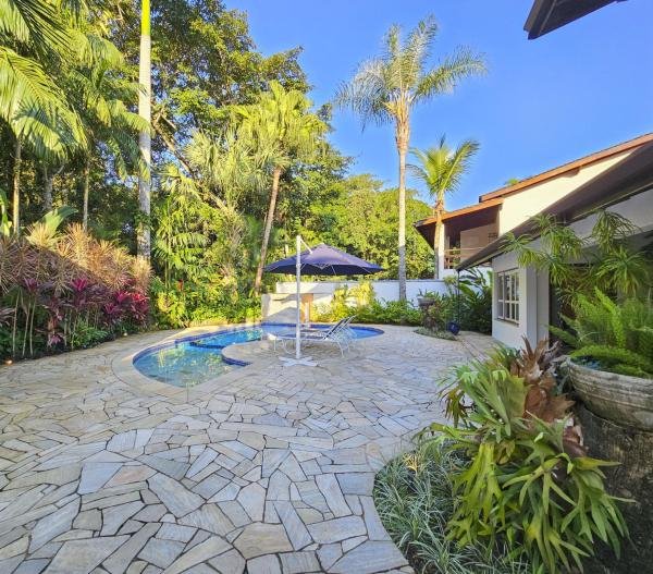 Belíssima casa assobradada, bem arejada, localizada em rua larga, contendo 4 suítes amplas, sendo uma no térreo, com ar-condicionado, living para 2 ambientes, lareira, sala de TV, lavabo, 4 vagas de garagem, cozinha americana, edícula, depósito, área de serviço, piscina com cascata, área gourmet com churrasqueira e forno a lenha. Sua área construída é de 339,20 m2 em um terreno grande de 576,67 m2.