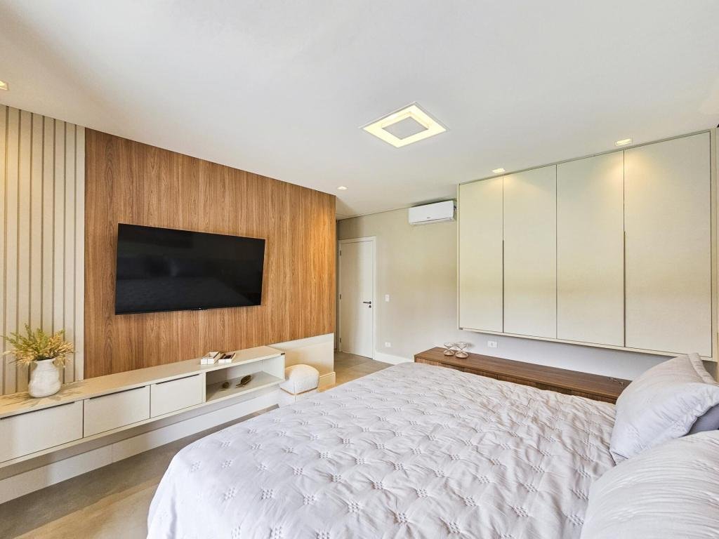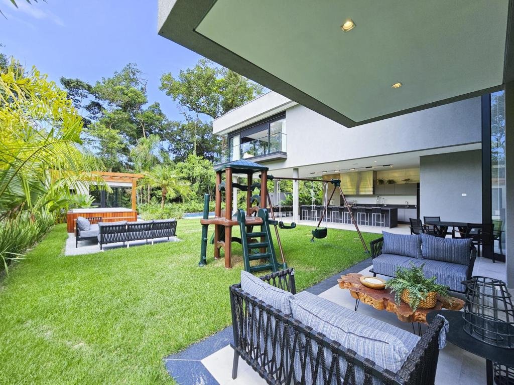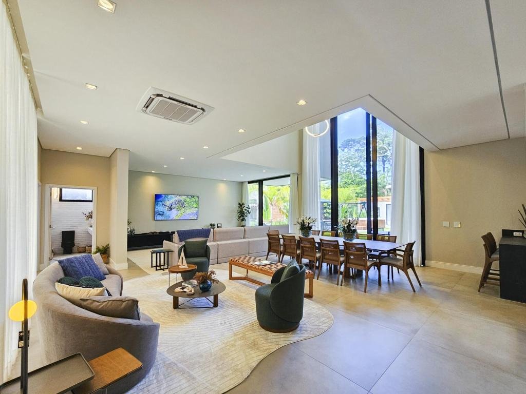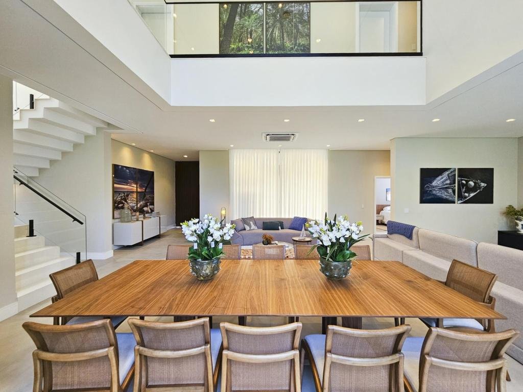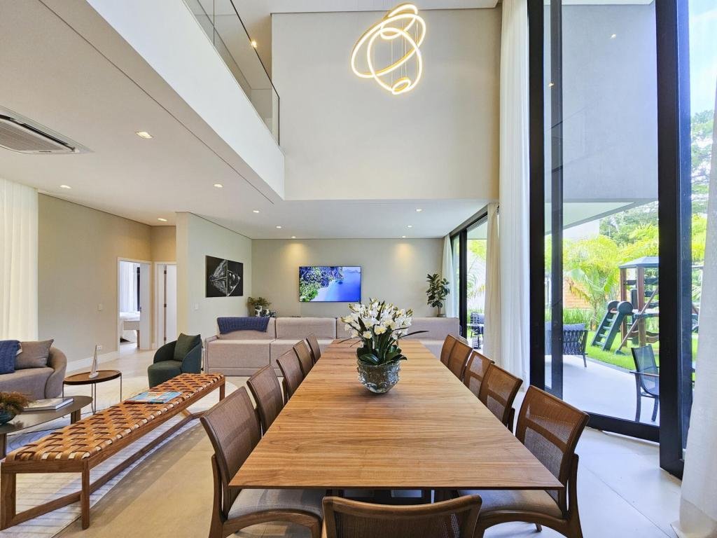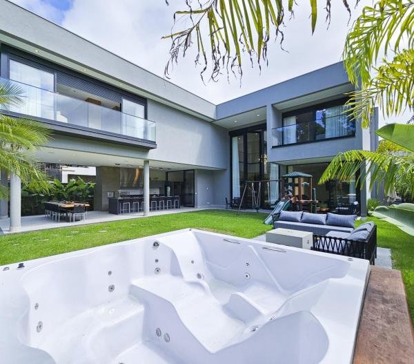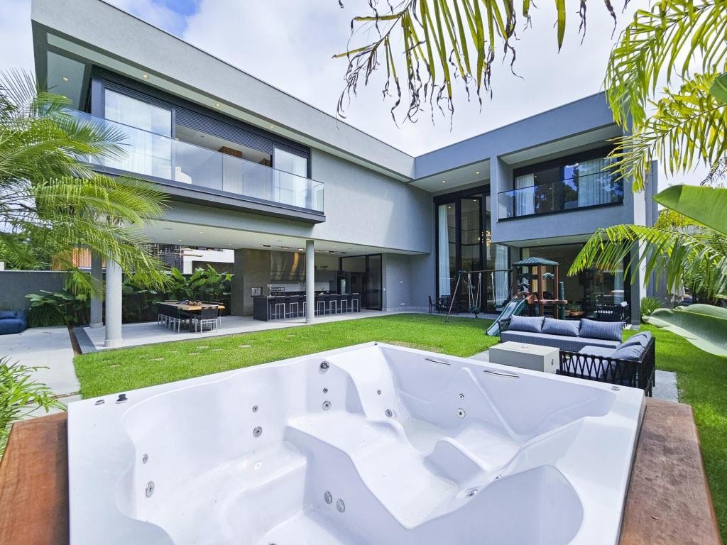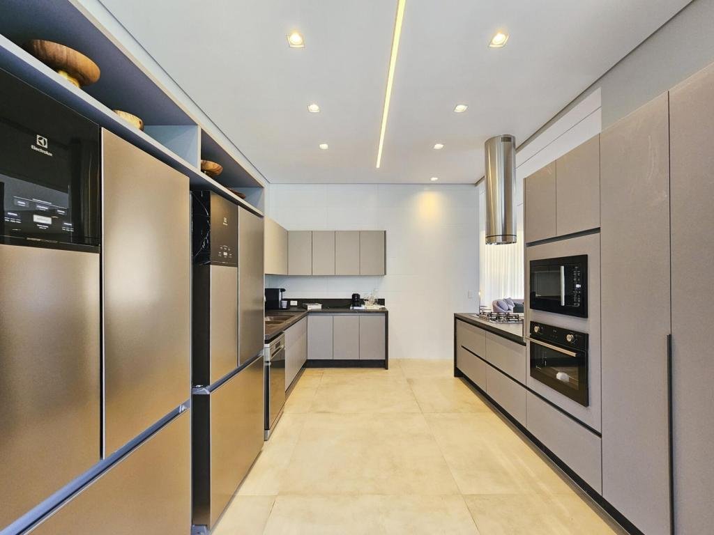 Majestosa e exuberante, é a definição para essa mansão, conta com 7 suítes, sendo uma no térreo, todas com armários embutidos e ar-condicionado, dentre elas, uma suíte master com closet e banheira (WCs Sr. e Sra), 2 pavimentos, living para 3 ambientes, com ar-condicionado, persianas automáticas, porta de entrada com fechadura eletrônica, lavabo, adega, cozinha americana, com armários, completa. Possui dormitório e WC de empregada, depósito, área de serviço, 6 vagas de garagem e uma copa no pavimento superior. Sua área de lazer oferece, piscina aquecida, climatizada e integrada com a sauna, jacuzzi, energia solar, churrasqueira e forno de pizza integrada com a cozinha, chopeira, playground, lavabo e sistema de monitoramento. A área construída é de 622,38 m2 em um terreno de 752,25 m2. A casa está toda mobiliada com móveis da kitchens, desde banheiros, quartos, cozinha e etc....Pisos e revestimentos da Portobello, bancadas em Dekton e metais Docol.