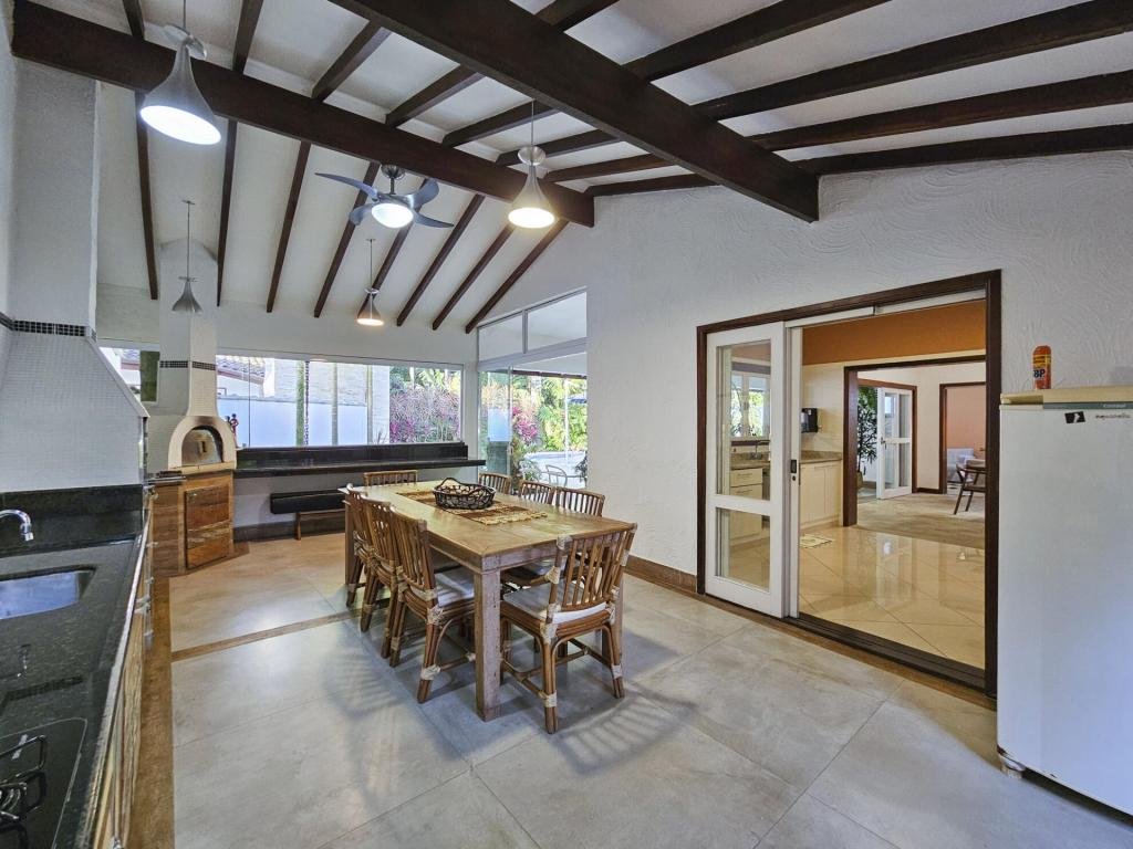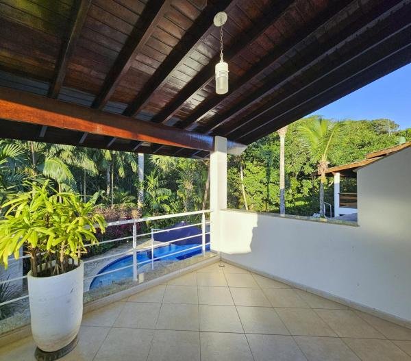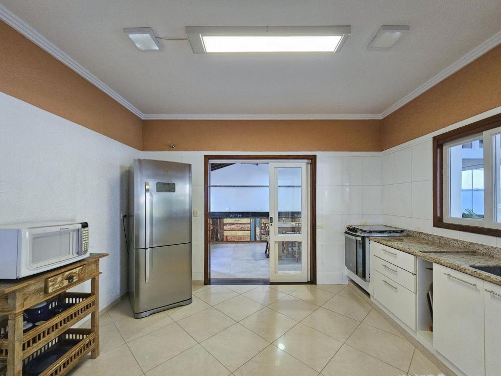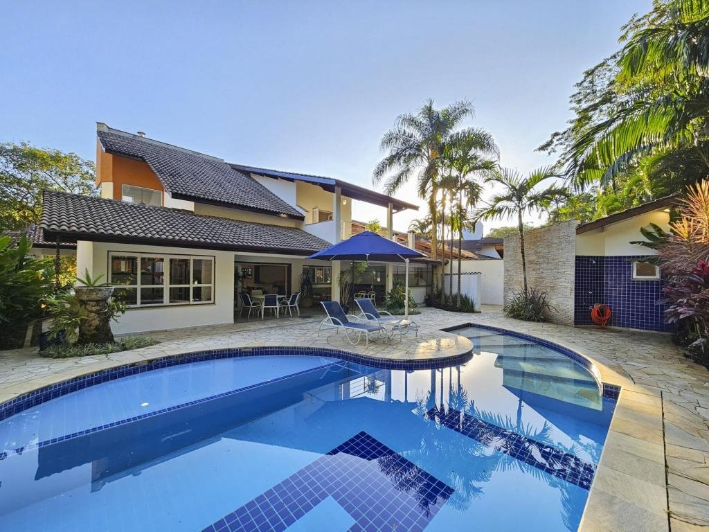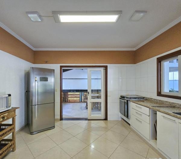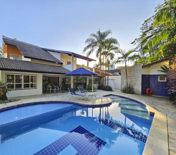 Belíssima casa assobradada, bem arejada, localizada em rua larga, contendo 4 suítes amplas, sendo uma no térreo, com ar-condicionado, living para 2 ambientes, lareira, sala de TV, lavabo, 4 vagas de garagem, cozinha americana, edícula, depósito, área de serviço, piscina com cascata, área gourmet com churrasqueira e forno a lenha. Sua área construída é de 339,20 m2 em um terreno grande de 576,67 m2.